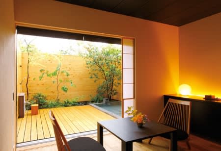 紫綬褒章を受章した、世界で活躍するインテリアデザイナー・内田繁氏がプロデュースする、露天風呂付きの客室は落ち着いて寛げる空間。