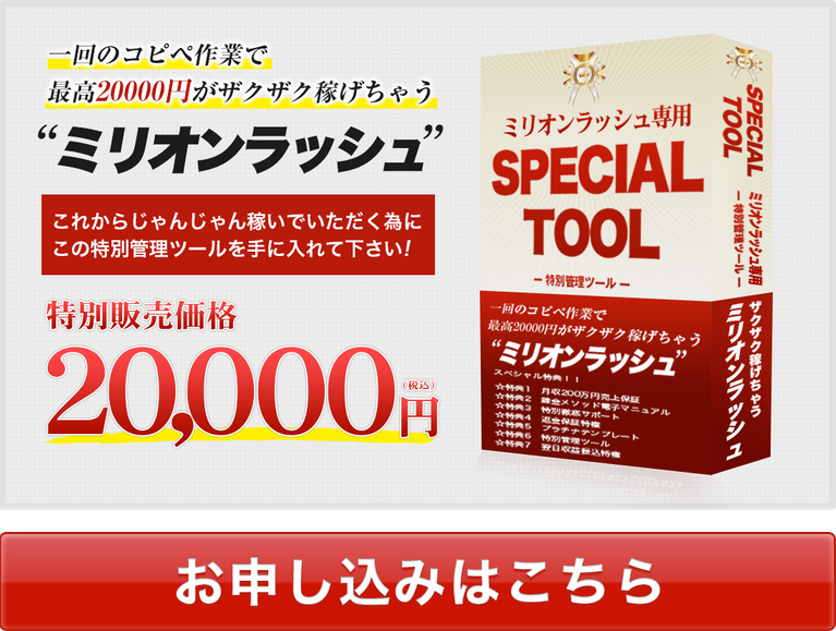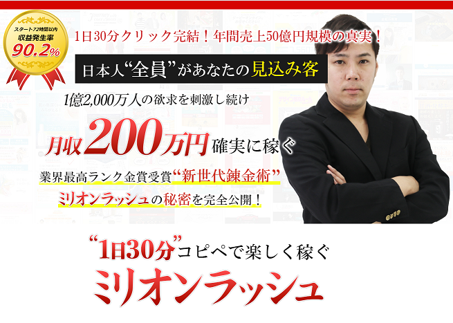 b><span style="font-size: x-large; color: rgb(255, 0, 0);">スマホ<span style="color: rgb(0, 0, 0);">を</span>30分間タップするだけ<span style="color: rgb(0, 0, 0);">で</span><br /><br />30日後200万円<span style="color: rgb(0, 0, 0);">を</span>稼げるビジネス<span style="color: rgb(0, 0, 0);">があったら</span><br /><br />アナタ<span style="color: rgb(0, 0, 0);">は</span>やってみたい<span style="color: rgb(0, 0, 0);">と思いませんか?</span></span></b><br /><br /><br /><div align="center"><a href="http://livedoor.blogimg.jp/fe00396-nagarabiz/imgs/2/2/22b43939.jpg" target="_blank"><img src="http://livedoor.blogimg.jp/fe00396-nagarabiz/imgs/2/2/22b43939-s.jpg" alt="ミリオンラッシュ7" class="pict" width="480" hspace="5" height="499" border="0"></a></div><br /><p><br /></p><p><br /></p><p>いろいろとネットビジネスのサイトとかを見ていると、<br /><br /></p><p>「初心者なら<span style="font-size: large; color: rgb(255, 0, 0);"><b>”ミリオンラッシュ”</b></span>が<span style="color: rgb(255, 0, 0);"><b>一番おススメ</b></span>です。」<br /><br /></p><p>という風潮が見受けられますね。<br /><br /><br /><br /><b>”ミリオンラッシュ”</b>をご存知の方もいらっしゃるかもしれませんが、<br /><br /></p><p>旬のニュースやエンタメ、ゴシップネタなど、<br /><br /></p><p>需要の大きな「キーワード」や「テーマ」に沿ってサイト記事を更新し、<br /><br /></p><p>そこから多くのアクセスを集め、</p><p><span style="font-size: large; color: rgb(255, 0, 0);"><b><br /></b></span></p><p><span style="font-size: large; color: rgb(255, 0, 0);"><b>「広告収入」を得る確実性のあるビジネスモデルになります。</b></span><br /><br /><br /><br />いざアフィリエイトを始めるとなると、大抵の方は<br /><br /></p><p>サイトにアクセスを集める、いわば集客の部分に苦労するのですが、<br /><br /></p><p>この”ミリオンラッシュ”の手法を用いると、<br /><br /></p><p>世のトレンドを狙った記事を書くので、特別な集客テクニックを用いずとも、<br /><br /></p><p>非常に多くのアクセスを集められるのが特徴です。<br /><br /></p><p>しかも、行うのは</p><br /><p><span style="color: rgb(255, 0, 0);"><b>1日30分間</b></span>だけで、<span style="color: rgb(255, 0, 0);"><b>スマホをタップ</b></span>したり、<span style="color: rgb(255, 0, 0);"><b>マウスをクリック</b></span>するだけの</p><p><br /></p><p>とってもシンプルなお仕事です!</p><p><br /></p><p><br /></p><p>まあ、このやり方自体6年以上も前から有名なもので、<br /><br /></p><p>確かにありきたりなサイト作成をするより圧倒的なアクセスを集められますし、<br /><br /></p><p>セールスをする必要もなく人気はあるのですが、<br /><br /></p><p>意外と文章力や多くの更新作業量が求められて骨が折れたり、<br /><br /></p><p>思ったほどアクセスが伸びなかったりするものです。<br /><br /><br /><br />仕事も仕事ですので、ここ数週間は今回の”ミリオンラッシュ”教材の<br /><br /></p><p>検証および自分たちでの実践をしておりまして、<br /><br /></p><p>その報告?ということで皆さんにお伝えしたいと思います。<br /><br /><br /><br /><br />作業工程やデメリットのことなども踏まえて、<br /><br /></p><p>今から取り組むにふさわしいかどうか厳密にお話していきますので、<br /><br /></p><p>少しでも興味がある方は最後までお付き合いください。<br /><br /><br /><br /><br /></p><div align="center"><a href="http://livedoor.blogimg.jp/fe00396-nagarabiz/imgs/c/6/c68934e8.png" title="ミリオンラッシュ1" target="_blank"><img src="http://livedoor.blogimg.jp/fe00396-nagarabiz/imgs/c/6/c68934e8-s.png" alt="ミリオンラッシュ1" class="pict" width="480" hspace="5" height="342" border="0"></a></div><br /><p><br /><br />[運営者]株式会社SO-HO<br /><br />[代表者名]光浦<br /><br />[電話]0800-800-6225<br /><br />[E-mail]million@vorush.com<br /><br />[販売価格]<strike>30万円</strike>→<span style="color: rgb(255, 0, 0);"><b>今なら¥20,000-</b></span><br /><br /><br /><br /><b><span style="color: rgb(255, 0, 0);">”フィリエイトとは、非常に多くのアクセスを集めなければまともな収入にはならない。”</span></b><br /><br /><br />それがこれまでの私の実践に裏打ちされた考えであり、<br /><br /></p><p>“労力対効果”という面でどうしても疑問というのもあり、<br /><br /></p><p>複雑な心境で当教材を手に取ってみたわけですが、<br /><br /></p><p>ザックリとマニュアルを読み進めてビジネスモデルを確認してみると<br /><br /></p><p><span style="font-size: large; color: rgb(255, 0, 0);"><b>「実に面白いノウハウだ!」</b></span>というのが最初の感想です。<br /><br /><br /><br />ここで“面白い”と表現したのは、<br /><br /></p><p>記事コンテンツとして、<br /><br /></p><p>集客面、内容面ともに差別化が図りやすいという理由からです。<br /><br /><br /><br /><b><span style="color: rgb(255, 0, 0);">単刀直入に言うと、既存のアフィリエイターが、<br /><br /></span></b></p><p><b><span style="color: rgb(255, 0, 0);">普段から実践している作業面や戦略とはまるで違うということ。</span></b><br /><br /><br />ビジネスとは常に需要と供給の隙間を見つけだし、<br /><br /></p><p>そこにポジションを置いて独自のサービスを展開することが<br /><br /></p><p>長く稼ぎ続けられると同時に、高い収益