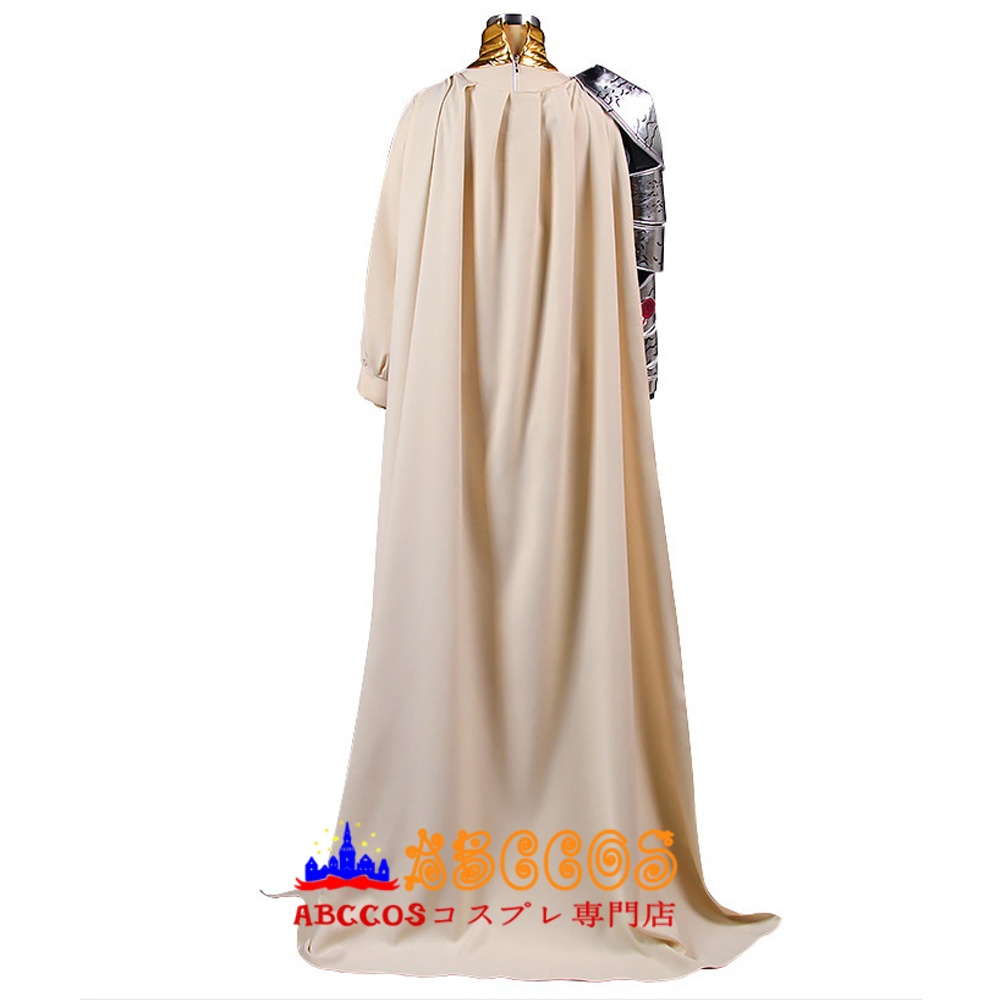 ロングケープ:クリーム色のフロントケープは、動きの中で美しく広がり、圧倒的な存在感を演出します。