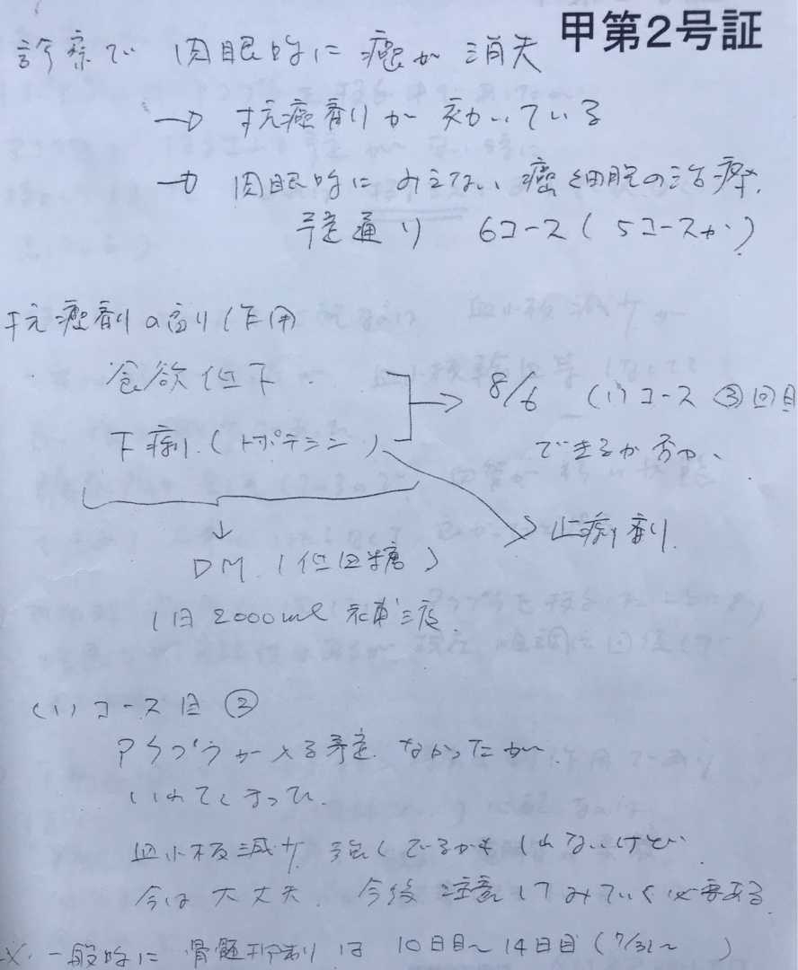 2.↑に「8月6日の3回目の抗がん剤投与ができるか否か」一番下には「骨髄抑制は10日目〜14日目」と書いてある。