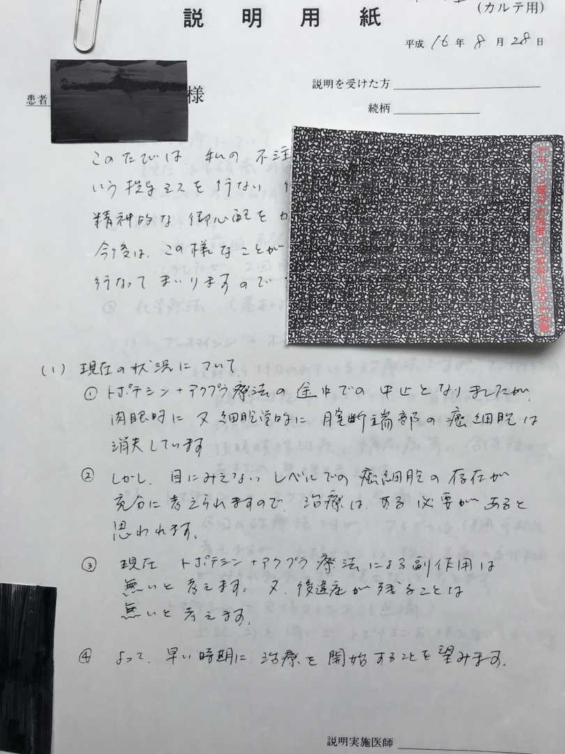 医療ミスで中断したのに10円玉大の腫瘍は消失していると言う。