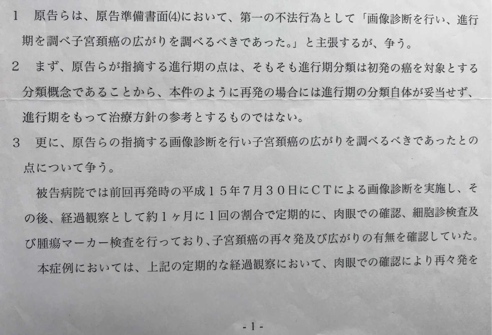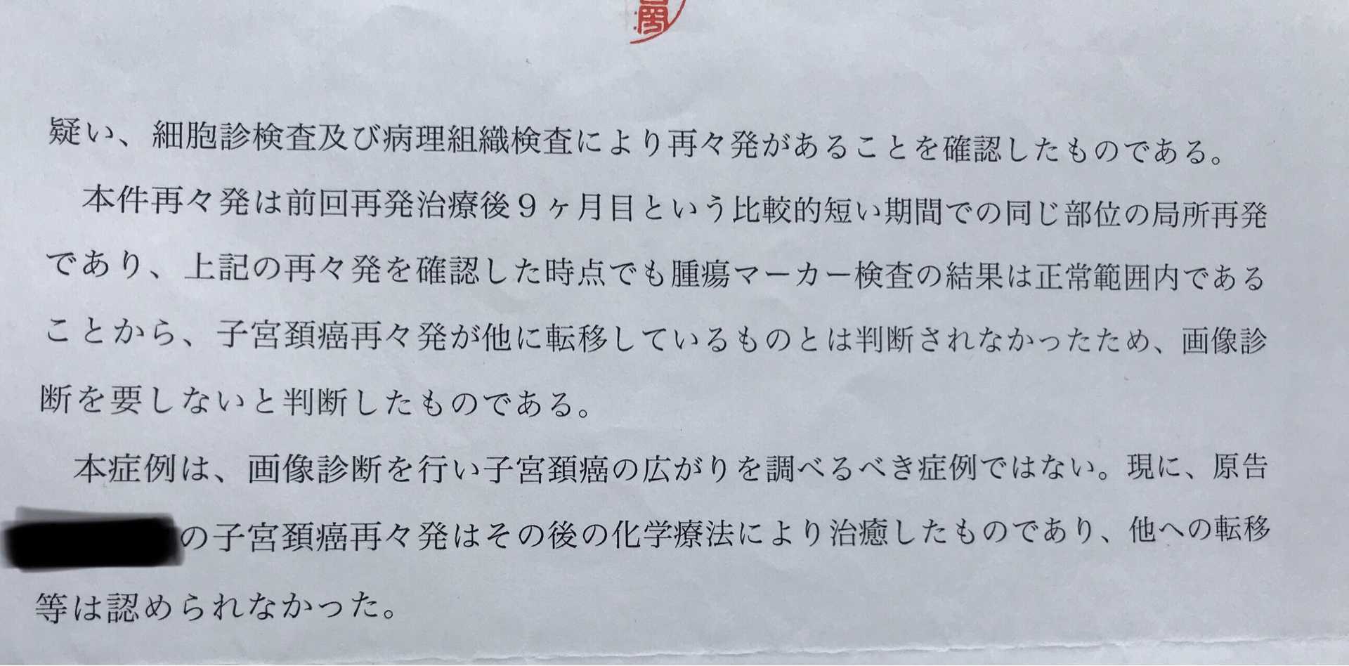 病院側は「現に、患者の子宮頸癌再々発はその後の化学療法により治癒したものであり、他への転移等は認められなかった。」