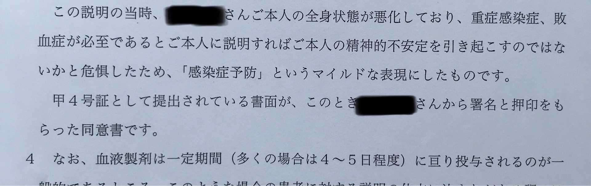 [重症感染症、敗血症が必至であるとご本人に説明すればご本人の精神的不安定を引き起こすのではないかと危惧したため「感染症予防」というマイルドな表現にしたものです。]と述べている。