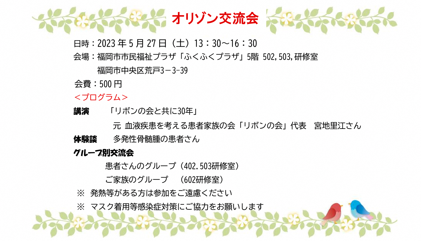 交流会の御報告(2023年5月27日 開催)福岡県とその近隣県を中心に活動しています、「骨髄腫患者と家族の会 福岡オリゾン」です。 2023年5月27日(土)に開催いたしました「オリゾン交流会 2023」の内容をアップしました。 ご興味のある方は、ご一読して頂ければ幸いです。 骨髄腫患者と家族の会福岡 オリゾン「骨髄腫患者と家族の会福岡 オリゾン」のホームページへようこそ!blog.livedoor.jp