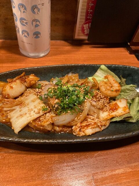 甘辛いソースで炒めた韓国風ホルモン炒めってところかな。。︎