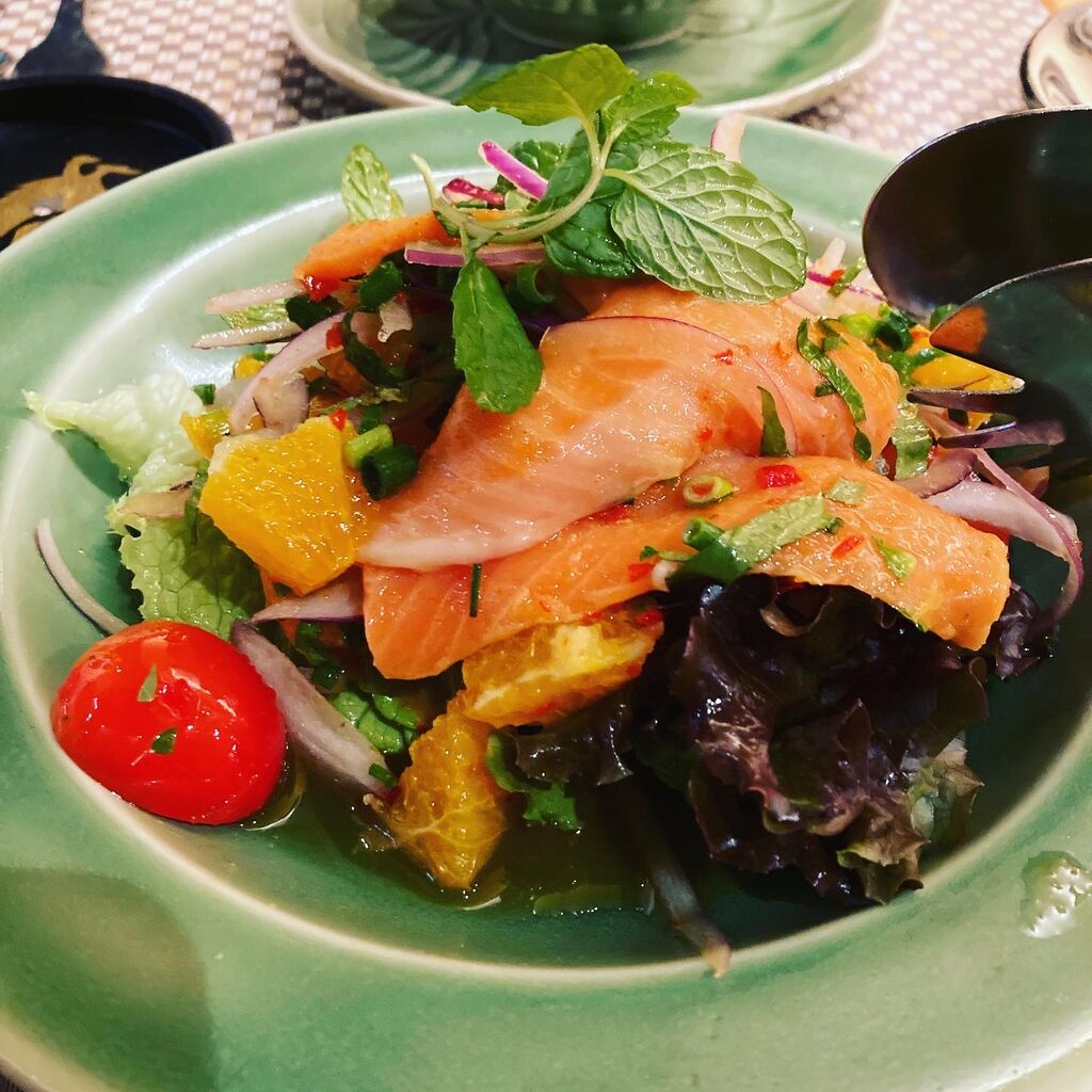 前菜①サーモンとフルーツのサラダ。。