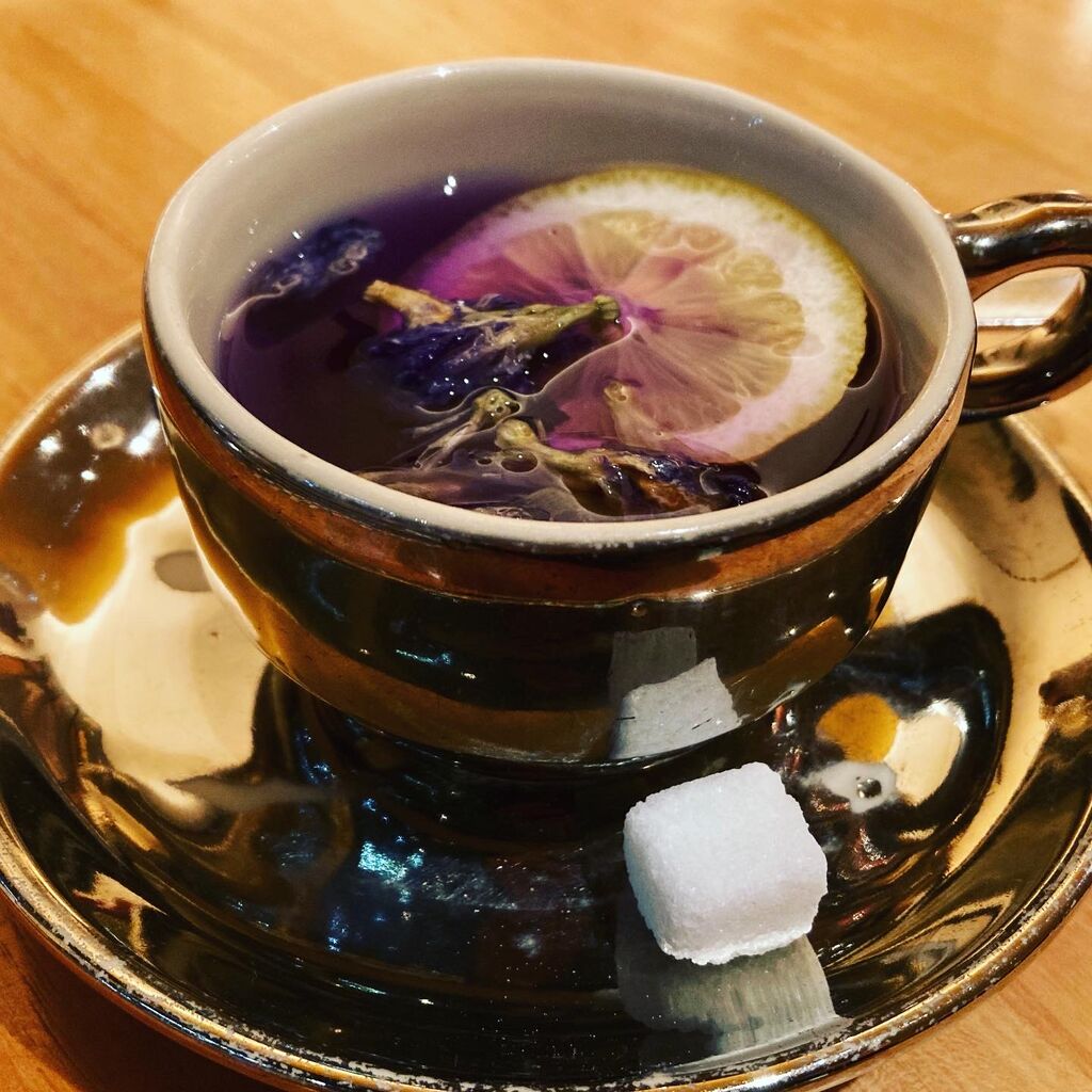 食欲を失せる青い水色。。レモンひとつで一気に紫に。。