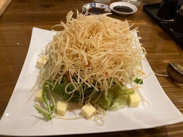 餃子の皮を細切りにして揚げたものをお野菜の上にトッピング。。