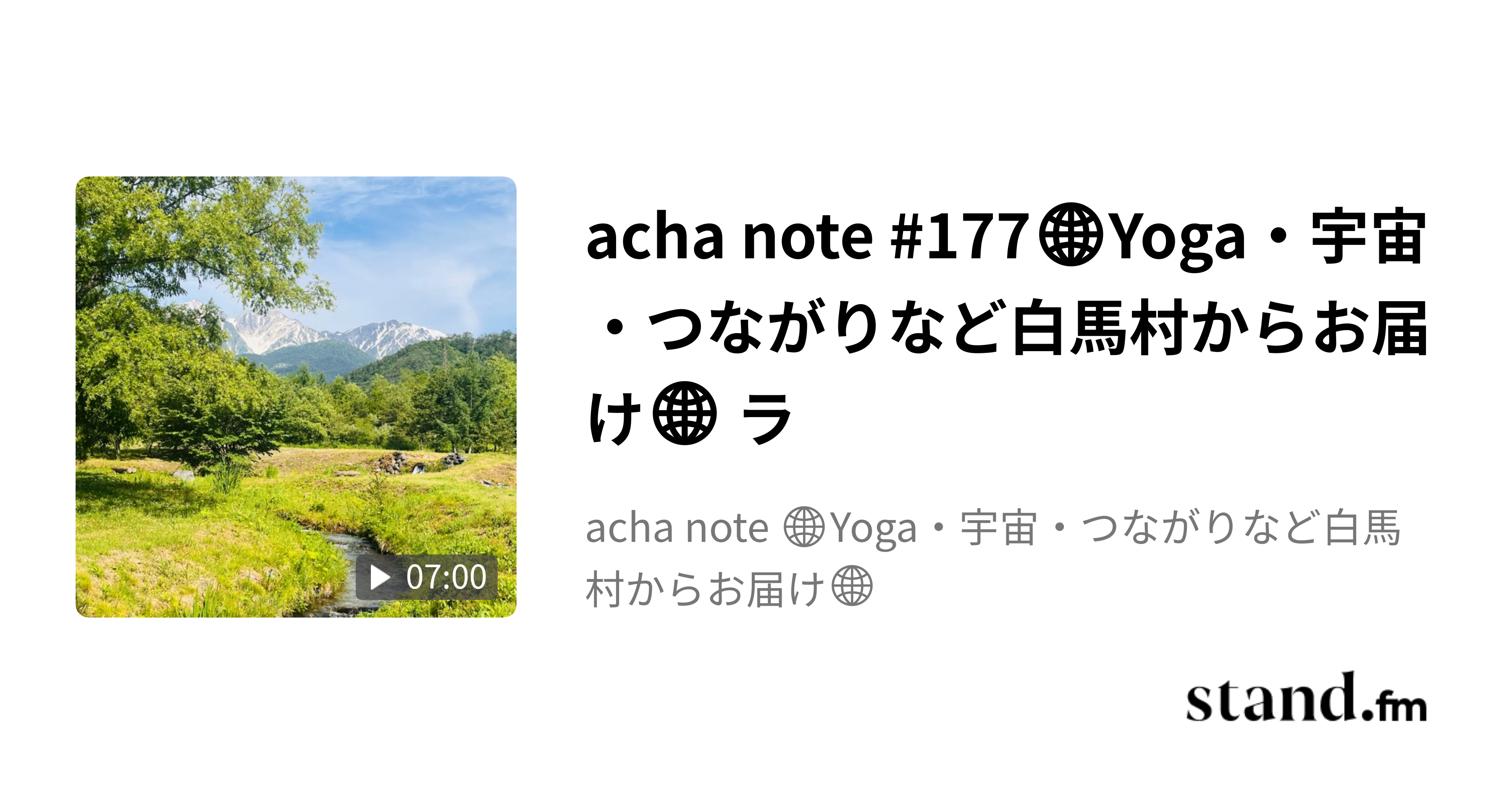 acha note #177🌐Yoga・宇宙・つながりなど白馬村からお届け🌐 ラ - acha note 🌐Yoga・宇宙・つながりなど白馬村からお届け🌐 | stand.fm2024.06.17 白馬村 松川のほとりからお届け。 …と思ったら録音できておらず😆😆😆!! 画像だけ、川のほとりです☆ 悔いなき人生を送るには、 そのときその瞬間を。 笑顔でいきましょうー!! 色々あっても、消化して昇華する!笑 いつもありがとうございます。 愛と光と感謝を込めて💫 #白馬村…stand.fm