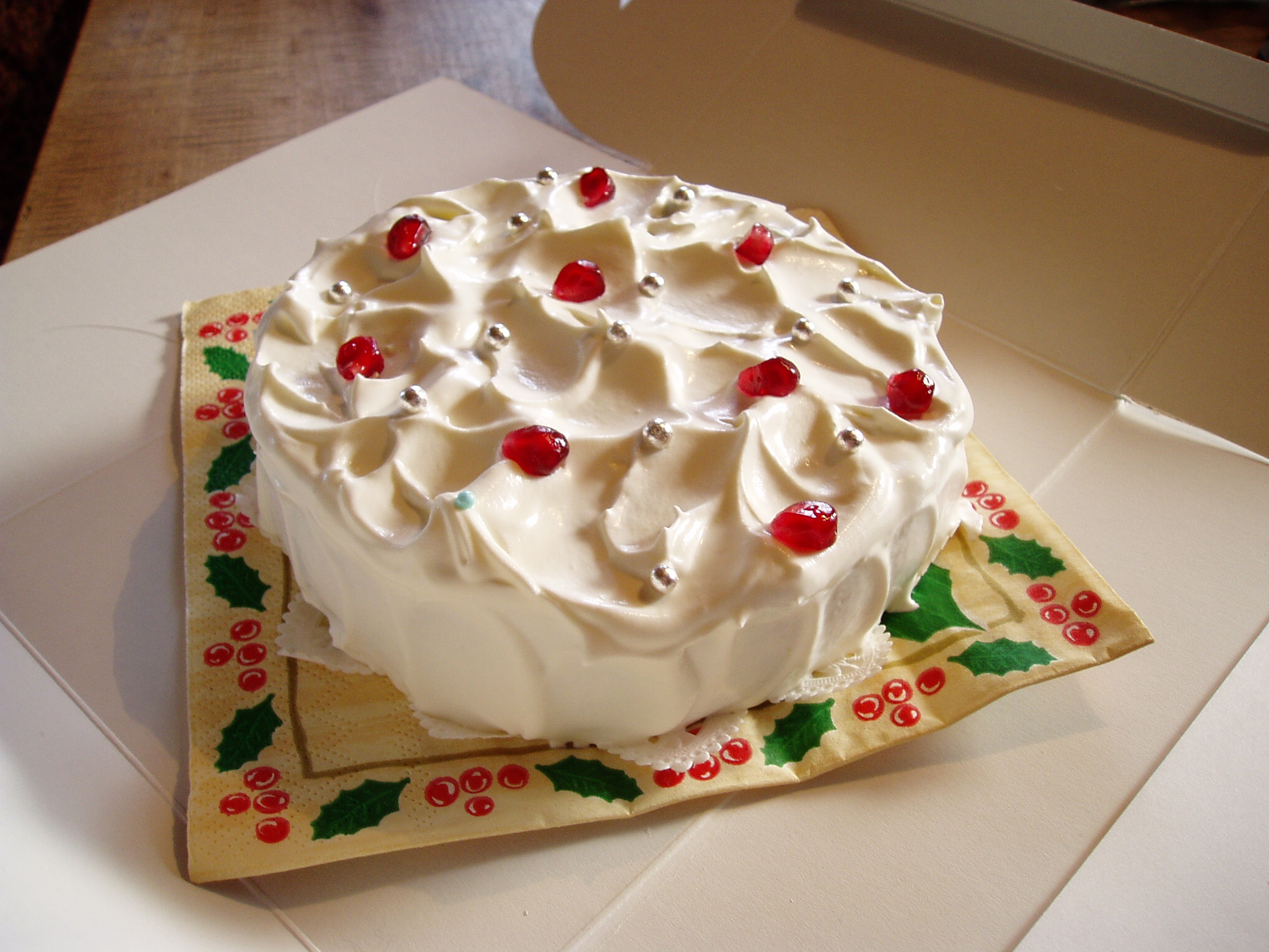 デコレーションは真っ白なクリームをスプーンでラフに仕上げて、アクセントにはザクロ