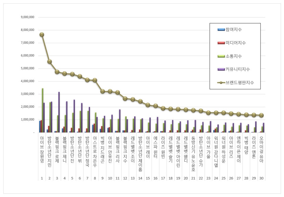 아이브 장원영, 아이돌 브랜드브평 1위…BTS 지민·블랙핑크 로제 제쳤다아이브 장원영이 2025년 9월 아이돌 개인 브랜드평판 1위에 올랐다. 2위는 방탄소년단 지민, 3위는 블랙핑크 로제였다.한국기업평판연구소는 8월 25일부터 9월 25일까지 1,730명의 아이돌을 대상으로 한 개인 브랜드 빅데이터 1억 3,445만 6,996개를 분석해 순위를 발표했다. 이는 지난달보다 3.67% 증가한 …www.gpkorea.com