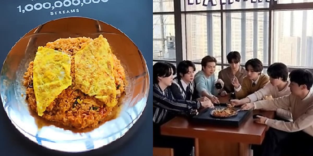 BigHitのロゴに模った卵焼きをのせ、メンバー全員がおいしそうにビビンバを食べる動画。