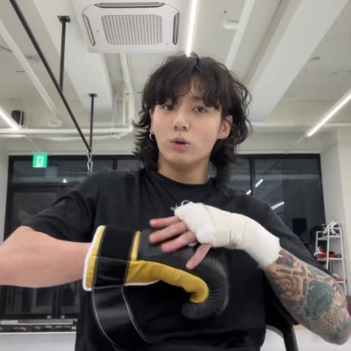 真夜中にグクのVLive開始のお知らせが携帯にピンと入り、何事かと思い見てみたら、何と12時過ぎにTommyのジムからボクシングの練習映像を流すという、予想外の展開。こんな時間にジムが開いているというのもすごいけど、ライブで練習見せちゃうグクもすごい![]()