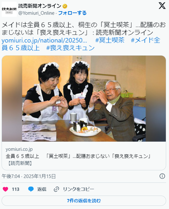 【群馬】メイドは全員65歳以上、桐生の「冥土喫茶」…配膳のおまじないは「喪え喪えキュン」 : 痛いニュース(ノ∀`) 1 :Ikhtiandr ★:2025/01/16(木) 13:33:42.91 ID:eRJDZ8m69.net メイドは全員65歳以上、桐生の「冥土喫茶」…配膳のおまじないは「喪え喪えキュン」 : 読売新聞オンライン https://t.co/Hzv5yhMO2H #冥土喫茶 #メイド全員65歳以上 #喪え喪えキュン—itainews.com