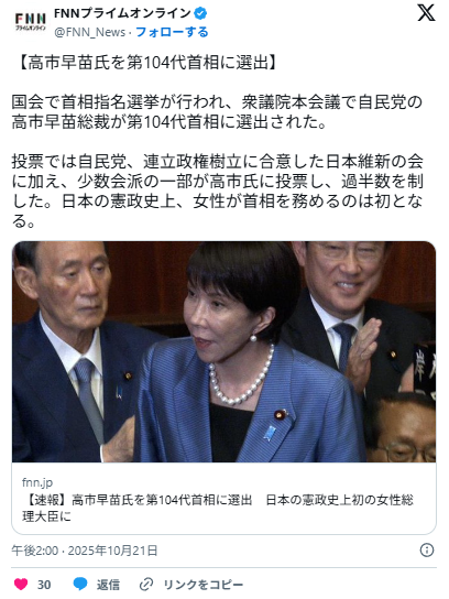 自民・高市早苗総裁が第104代首相に選出 憲政史上初の女性首相 : 痛いニュース(ノ∀`) 1 名前:どどん ★:2025/10/21(火) 13:54:25.92 ID:/g/i5BT39.net 【高市早苗氏を第104代首相に選出】国会で首相指名選挙が行われ、衆議院本会議で自民党の高市早苗総裁が第104代首相に選出された。投票では自民党、連立政権樹立に合意した日本維新の会に加え、itainews.com