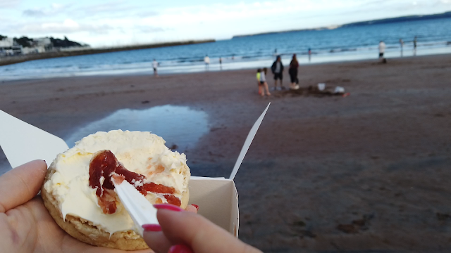 午後は適度に太陽が輝いていましたが、大きな幸せをもたらしました。 最初の光線を見て、私たちはすぐに居心地の良い小さなパン屋に戻りました。 テイクアウェイクリームティーについて聞いたことがありますか? そこで彼は、クリームとジャムの2つの小さなクッキーを、ナイフとナプキンと一緒に箱に入れました。 数分後、私たちは地下鉄のサンドイッチ、お茶、クリームティーのセットを持ってビーチに向かいました。 不快ながらも誇らしげに、私たちは階段に腰を下ろし、その日の最初の、しかしゆっくりと最後の光線を楽しみながら、サンドイッチとクッキーを食べ、お茶を飲みました。 その間、私たちは、フロートを持って一人で氷のように冷たい水に入った、自己危険な子供を見ました。 そして楽しんだ!