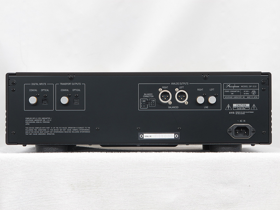 アキュフェーズ Accuphase DP-510 CDプレーヤー 保証付SOLD OUT価格: 230,000円(税込)商品は本体、電源ケーブル、RCAケーブル、リモコン、元箱、取扱説明書、保証書です。※保証書は個人情報が記載されているため、写真には写していません。 メーカー保証が2014年8月まで残っています。 保証書は名義変更後に別途発送致します。動作確認済みです。外装は使用感も少なく、主観ですが、美品の部類です。保証書は名義変更後に別途発送致します。ショールームで試聴出来ます。※オリコのショッピングクレジットがご利用出来ます。