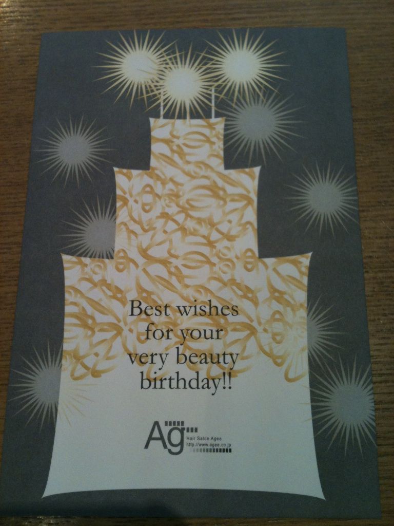 バースデイカードAgeeからお客様のお誕生月にお送りしているバースディカード、御存知ですか ヘッドスパやトリートメントメニューが半額、その他眉カットや前髪カットも無料で出来ちゃう お得なカードなのです。 もし御住所を登録されていない方で、バースデイカードをお送りしてもよろしい方は、 すぐに担当者までお声掛け下さいそうそう バースデイカードの有効期限はお客様のお誕生月になりますので 御注意くださいね