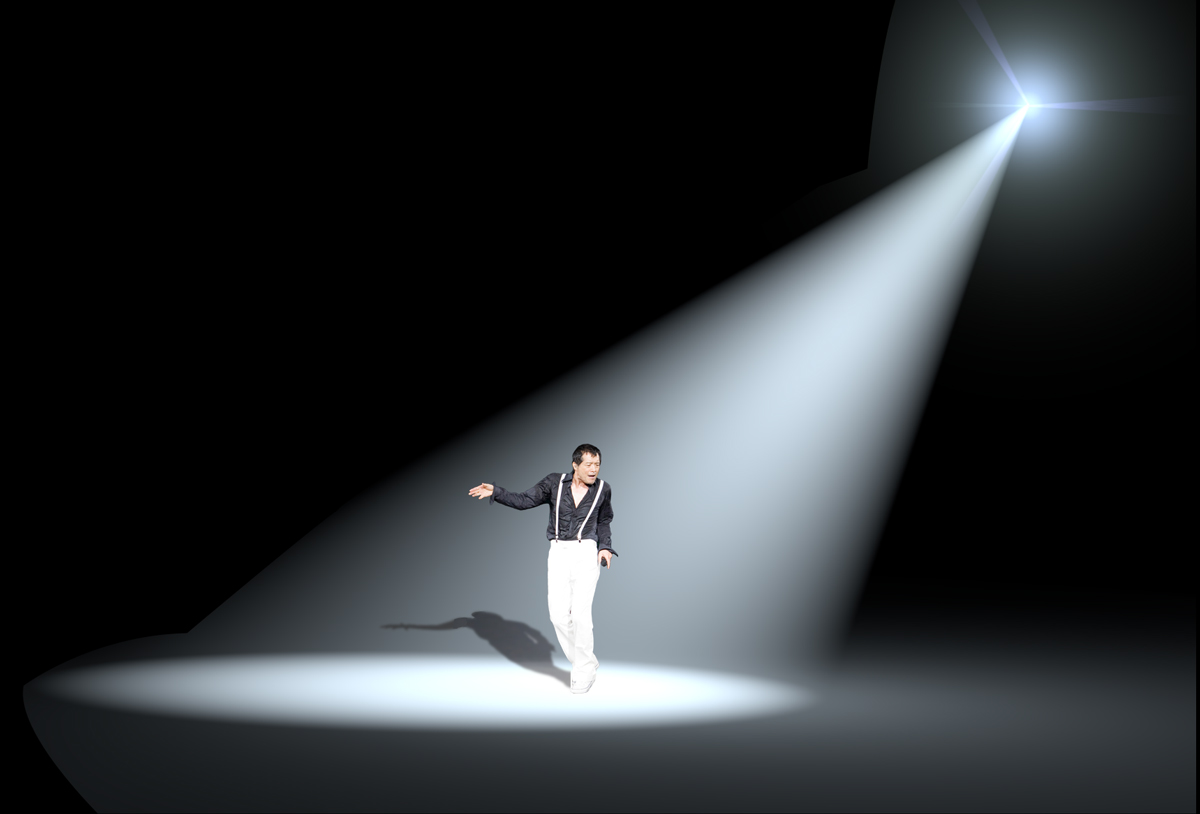 ライトの方向からすると、影はステージの床部分に横長に映るはずです。
