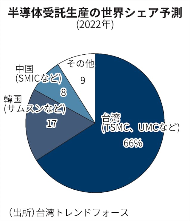 【台北=龍元秀明】台湾の調査会社トレンドフォースは25日、台湾の半導体受託生産の世界シェア(売上高ベース)が2022年に66%に高まるとの予測をまとめた。21年から2ポイント拡大する。世界的な半導体不足を受け工場を新設する動きが活発化しており、当面は台湾への依存度が一段と高まる。