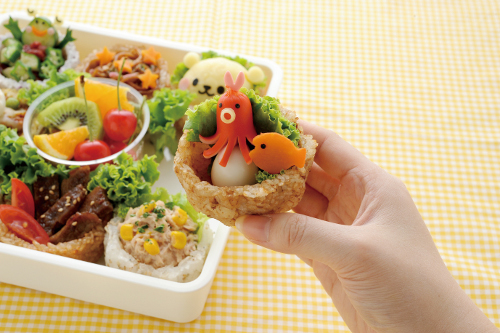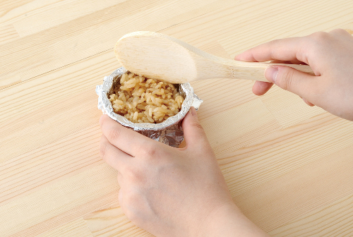カップ、カバー、押し具の3点セットになっており、アルミホイルを敷いたカップの中に、しょう油、おかかなど、お好みの食材とごはんを混ぜたものを入れ、押し具でぎゅっとフタをする。