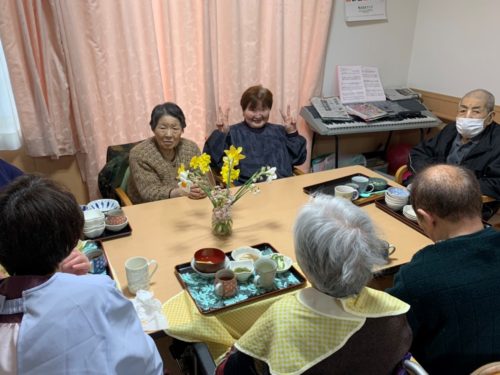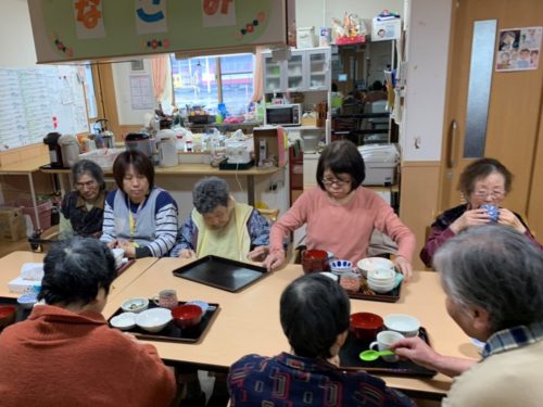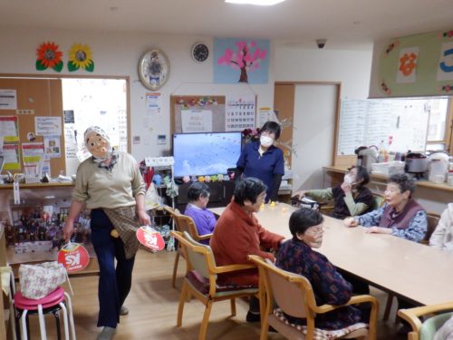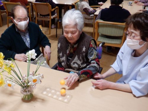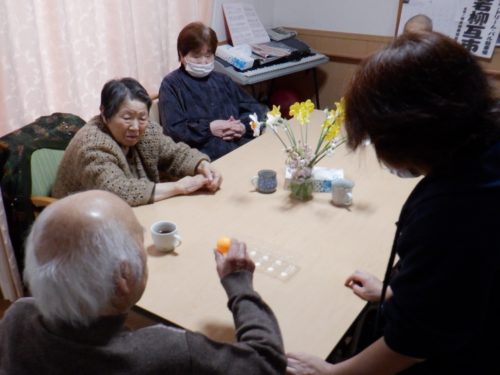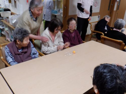 午後レクは「テーブル対抗ピンポン玉リレー」
