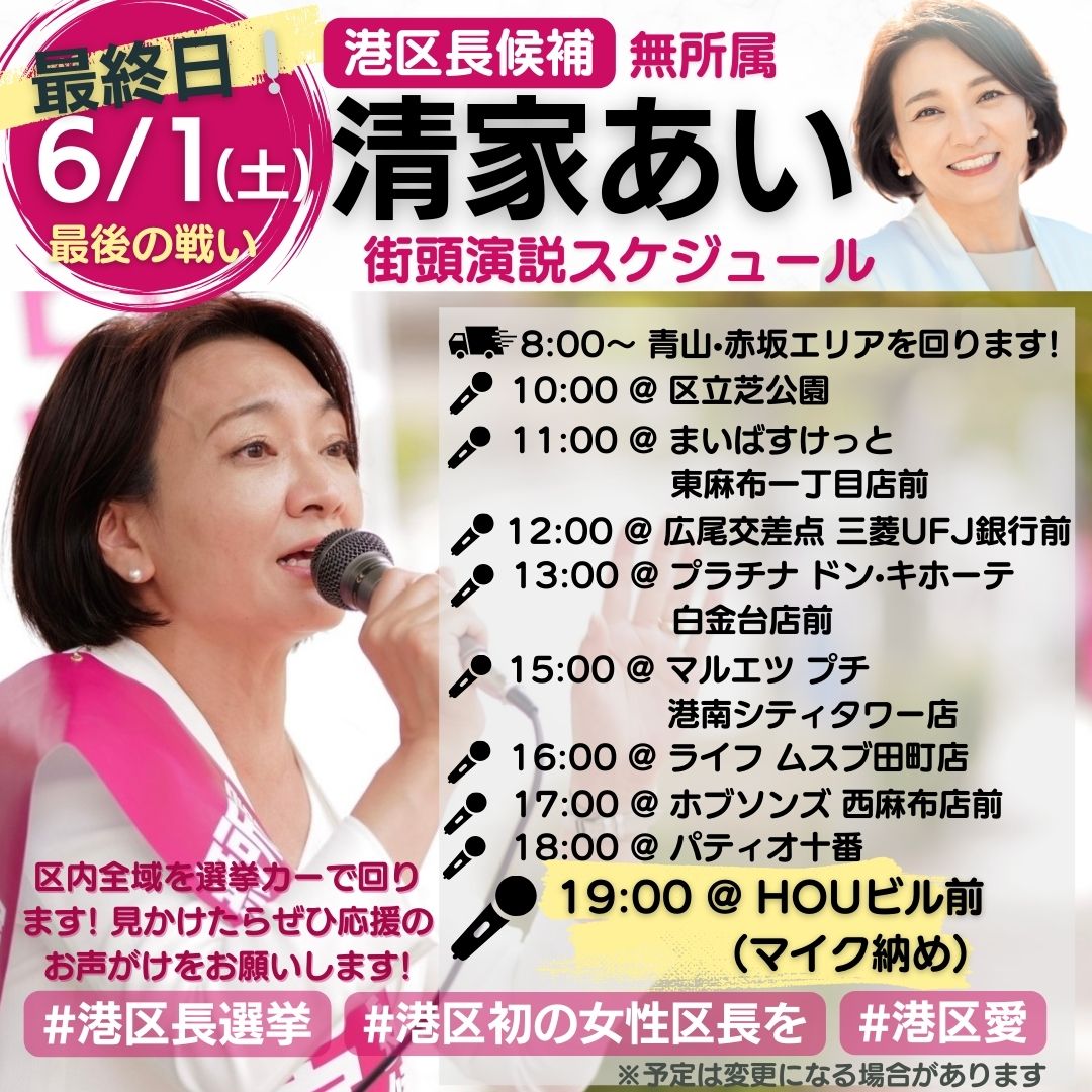 お詫びと変更🙇♀️【港区長選挙📢 6/1(土)最終日の街頭演説スケジュールご案内】