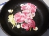 フライパンにオリーブ油を温め、スライスニンニク、千切りの生姜の香を出します。