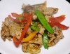 筋取した絹さやとパプリカスライスを加えて炒め合わせます。