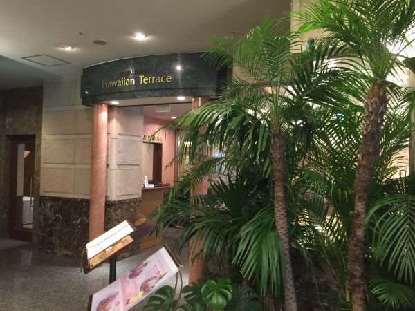 場所ですが、ホテルに入ってすぐに右側です。ハワイアンテラスという名前で、入り口もちょっぴりハワイアンですが、店内は普通の作りです。