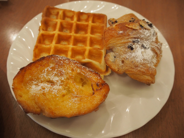 手前のパンはフレンチトーストです。時計回りにワッフル、クロワッサン(チョコチップなど入っています。)です。私の中でフレンチトーストは大ヒットでした。思わず、美味!と唸りました。味がしっかり染みています。自分でも色々と料理をするのですが、しっかりと事前に漬け込んでいることが感じ取れました。バターもしっかりと入っていて、砂糖の具合、焼き加減丁度良しです!このあと、フレンチトーストをさらに食べたことは言うまでもありません笑