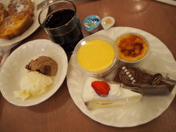 続いてはデザートです。アイスクリームやケーキ、プリンなど。ドリンクは、ホットコーヒー、アイスコーヒー、アイスティー、ウーロン茶、オレンジジュースがあります。ジュースの種類がもう少しあった方が、、、というのを感じましたが、ひとまず十分です。