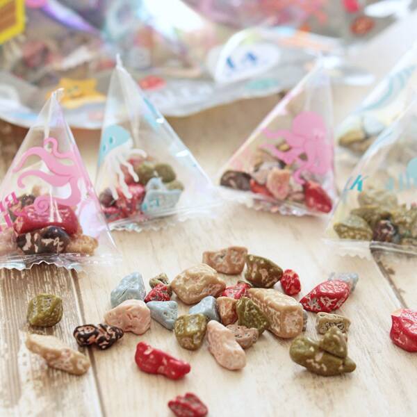 中に入っているのはまるで海岸に転がっている小石のような形のチョコレートです。味は二種類あって、ストロベリーがタコ、ミルクチョコがくらげのイラスト付きのもので、これを貰ったら「おお!かわいい!」と喜ばれる事必至。