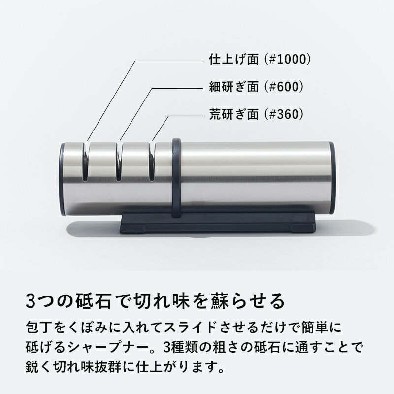 一般的な家庭用シャープナーは、セラミックや1~2段階の簡易砥石を用いたものが多く、仕上がりにばらつきが出やすい傾向にあります。これに対し、シャープナープラスは「#360(荒研ぎ)→#600(細研ぎ)→#1,000(仕上げ)」という3段階のダイヤモンド砥石を採用し、切れ味を段階的に回復させる構造となっています。