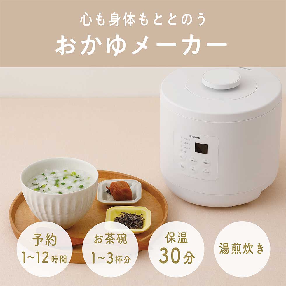 コイズミ おかゆメーカー KSC-0800 は、湯煎式で焦げ付きにくく、誰でも簡単に美味しいおかゆを作れる便利な家電です。