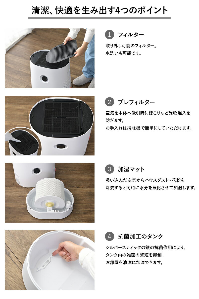 また、「お手入れのしやすさ」も大きな魅力です。加湿フィルターは洗濯機で丸洗い可能で、ドラムや水タンクも食器洗い機で洗浄できます。シンプル構造で分解も簡単なため、衛生的な状態を維持しやすいのが特徴です。