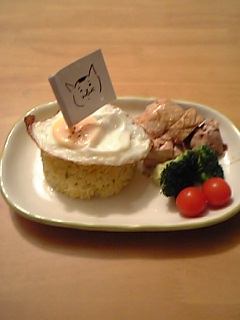 ネコムライスエッグチキン添え、です。鶏もも肉から取ったスープでご飯を炊き、