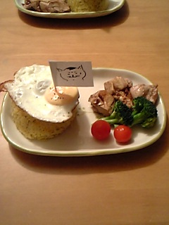 9.炊き上がった5.を型に入れお皿によそい、7.の目玉焼きを乗せます。