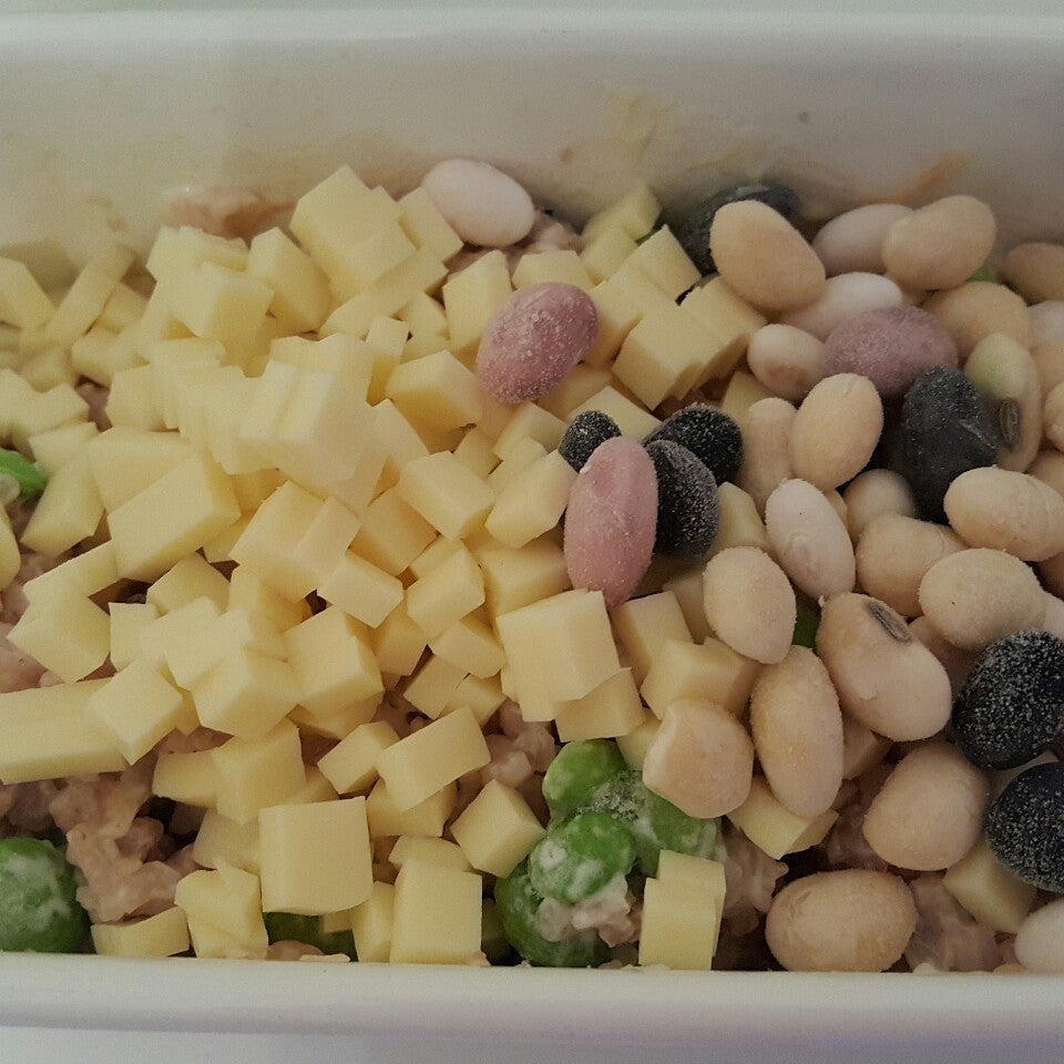 チーズ ミックスビーンズ 枝豆を加えて混ぜます