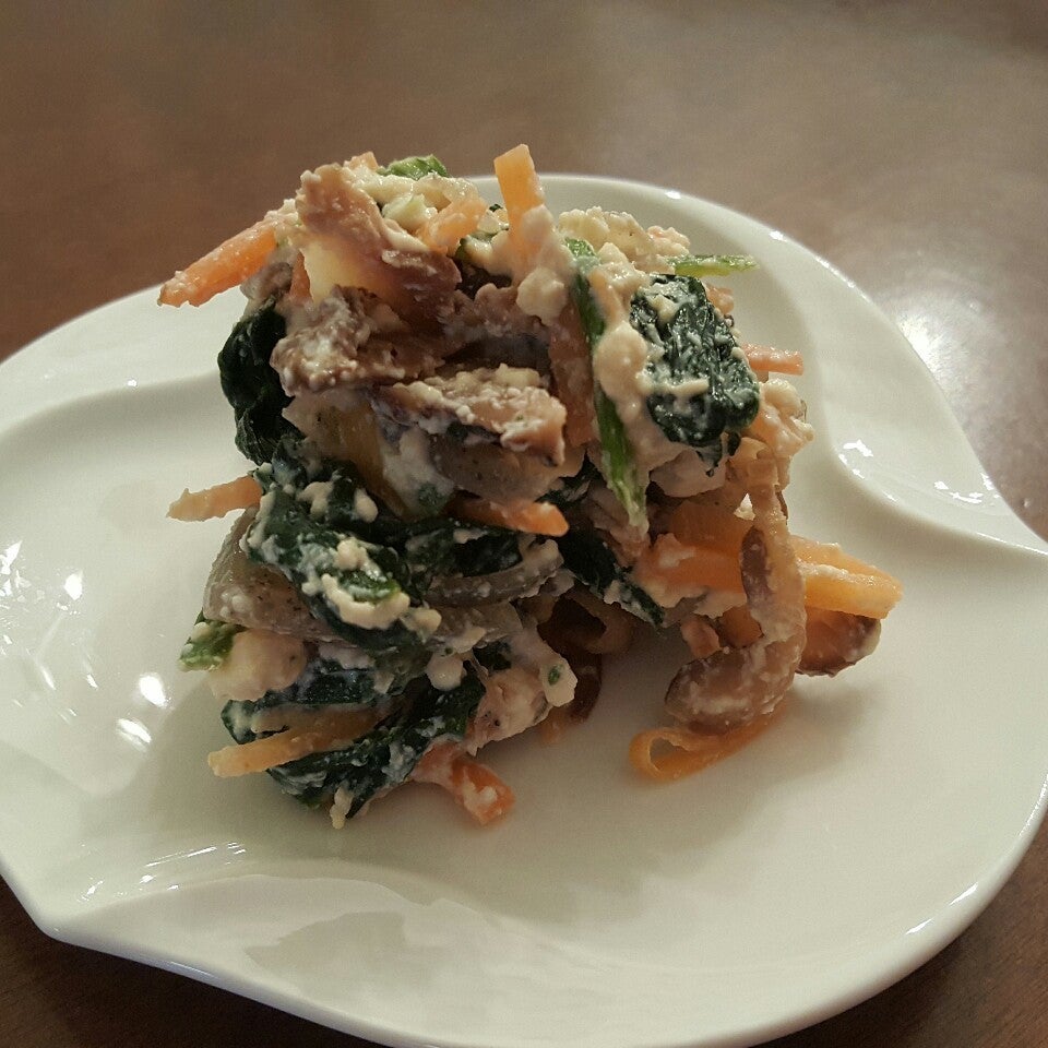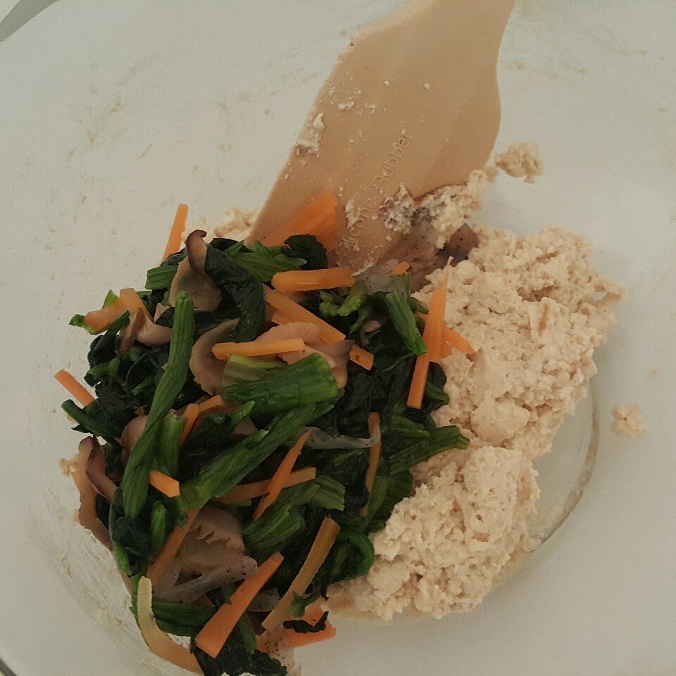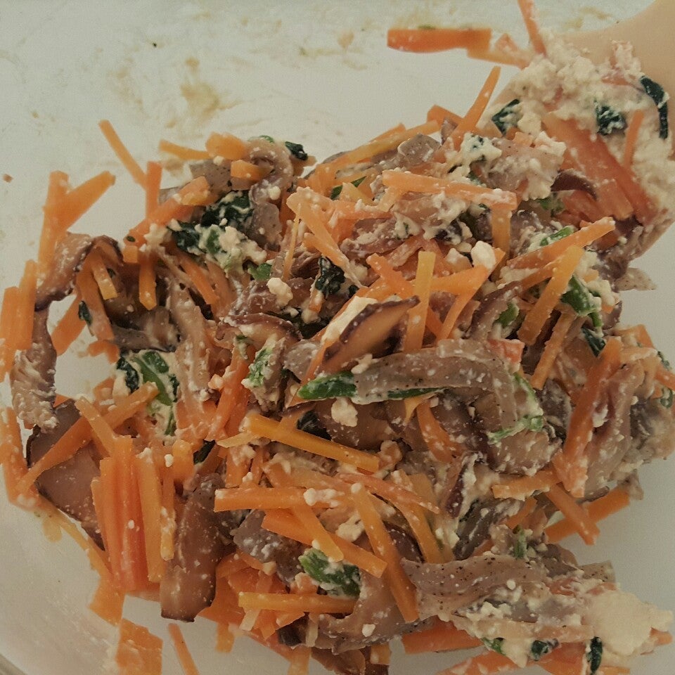 ほうれん草の彩り野菜和えを加えます(レシピはひとつ前にアップしてあります)
