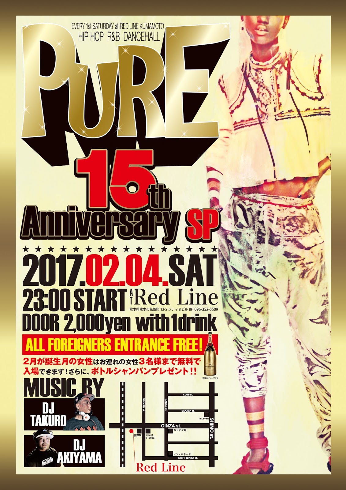 2/4(土) PURE 15th ANNIVERSARY at RED LINE2017.02.04 satPURE 15th Anniversary SPat RED LINE熊本市銀座通りシティ8ビル 8Fstart 23:00Music ByDJ TAKURODJ AKIYAMA"All Foreigners Entrance Free!"(外国人のお客様は入場無料)ADM 2,000yen (w/1Drink)2月が誕生月の女性はお連れの女性3名まで入場無料 +ボトルシャンパンプレゼント(要写真付きID)