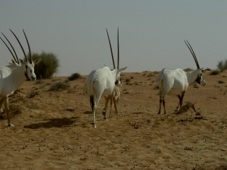 子供オリックス ここ、アルマハデザートのガゼルやオリックスは 実は半分自然に、また半分は管理されて生育しているようでした 餌場があって、時間になると草やプロテインのサプリメント また、塩も与えられているとのことでした 見えますか 子供のオリックス 生後3ヶ月くらいだそうです 自然から身を守るために 砂漠の色に近い色をしているのだそうです