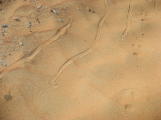 何の跡? Dune driveを終えてコテージへ帰るとき 砂漠の途中にやはりゲートがあって そこを閉じるときにフィールドガイドが見つけました 蛇が移動した跡だそうです きゃ~~ 昼間の暑い時間帯は もしゃもしゃした木(ブッシュといっていました)の 根っこの辺りに隠れているそうです サソリもいるって。。。 怖い、、、 でも、見たかったなぁ。。。