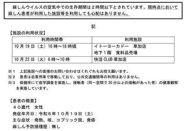 埼玉県で女性1名「はしか」感染…不特定多数と接触した可能性も | リセマム 埼玉県は2024年11月1日、県内において今年8例目の麻しん患者の発生を確認したと発表した。10月19日と22日に不特定多数の人が利用する施設への滞在歴が判明したことから、注意を呼び掛けている。s.resemom.jp