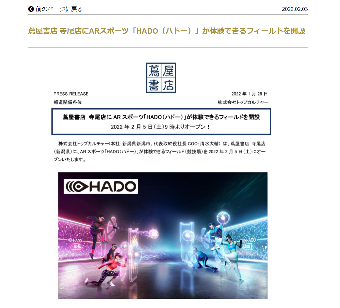 No.7341 材料はこれです。 202… - 7640 - (株)トップカルチャー 2020/09/12〜 - 株式掲示板材料はこれです。2022.02.03蔦屋書店 寺尾店にARスポーツ「HADO(ハドー)」が体験できるフィールドを開設2022年2月5日(土)9時よりオープン!決算は通過済みで、今期最終は黒字浮上、5期ぶり6円で復配しているのでその点は心配無いかと^^finance.yahoo.co.jp