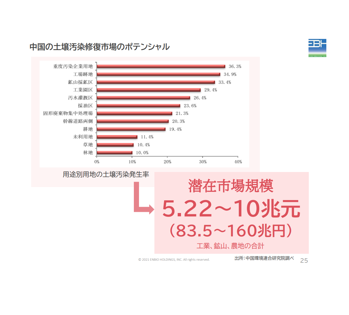上記で少し触れた、土壌汚染対策事業における「中国」と言うキーワードですが、中国の土壌汚染修復市場のポテンシャルは潜在市場規模5.22~10兆元(83.5~160兆円)と言う数字が述べられております。
