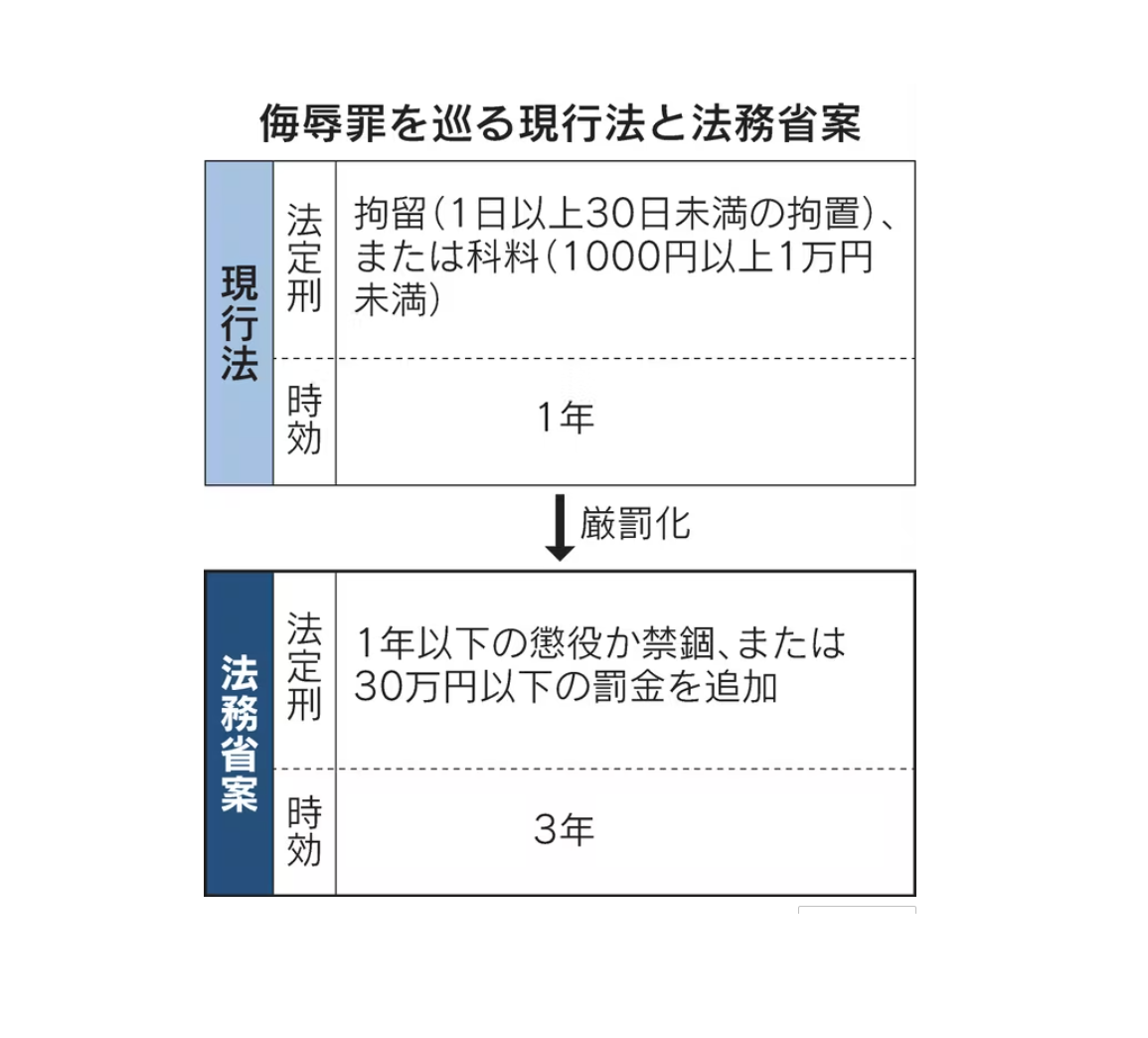 改正案ではSNS上のひぼう中傷対策を強化するため、公然と人を侮辱した行為に適用される侮辱罪に懲役刑を導入し、法定刑の上限を「1年以下の懲役・禁錮」と「30万円以下の罰金」に引き上げるとしています。
