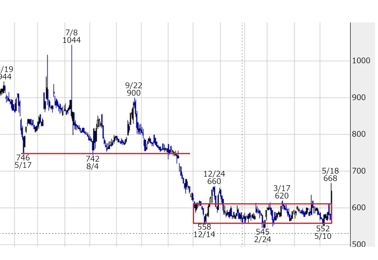 特にHMTのように740円のサポートラインを割って半年間もの間、底を這いながらじっとエネルギーを溜め込んでいたようなボックス圏で底を這ってる銘柄ほど、反発力が高くなります。