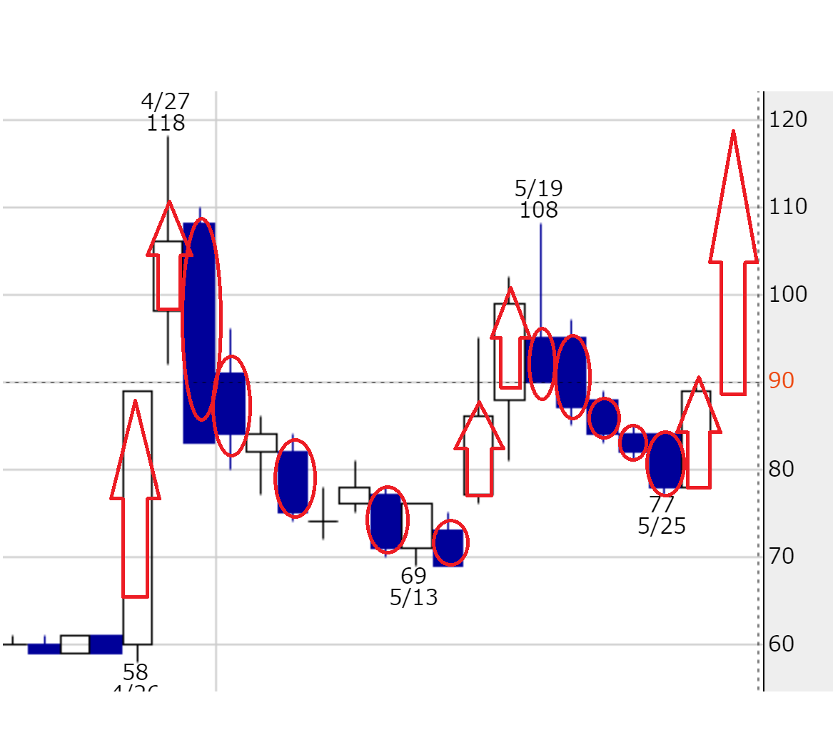 既に上で100万株近い出来高を作ってしこっており、まあダメだろうなと思っていましたが、90円まで窓を埋めて少し売りが落ち着いたので用意していた資料と共に書かせて頂きました。