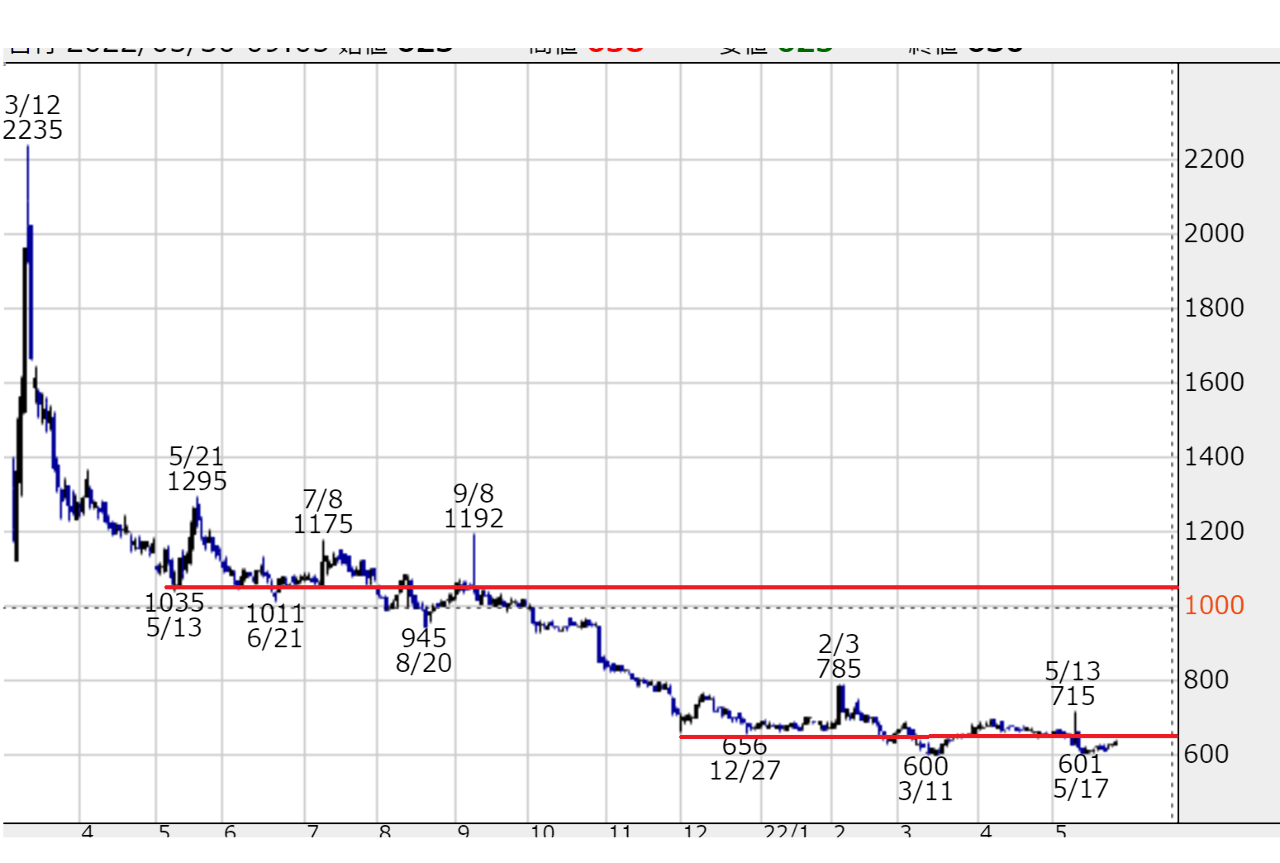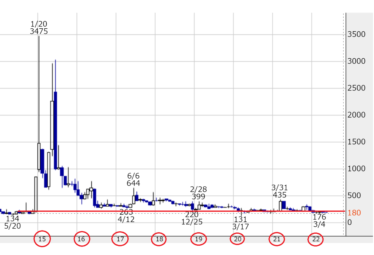 この画像はガーラが191円タッチで窓を埋めた時から何度も書いてきたチャートになりますが、底を這ってるところから動いてきたら、目先の数十ティックでガチャガチャ上下に激しく動いて翻弄されるのではなく、ドシッと構えて見られる心に余裕があるくらいのポジションでその企業のことを応援する気持ちを持って生産性の高い取り組みをする方が結果として良いではないだろうかと、個人的に思いました。